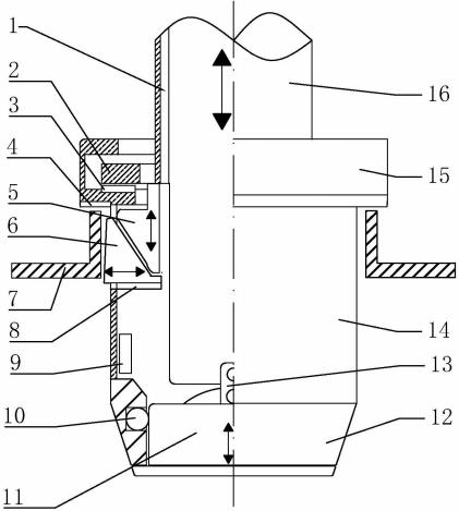 工作過程為:操作鶴管到油罐車口上方,鶴管下降、使對位體對準罐車口,對位體進入油罐車口,利用動力裝置繼續(xù)使鶴管下降,不同心位置由密封帽密封蓋水平移動密封。鶴管繼續(xù)下降,當一密封墊接觸油罐車口,對位活動壓盤繼續(xù)下降,推動一鎖緊塊向下動作,一鎖緊塊繼而帶動二鎖緊塊沿導軌滑動,從而鎖緊油罐車口,對位活動壓盤壓緊二密封墊。同時,密封體隨著鶴管下降,脫離接油斗,使油液順利流出,從而進行裝油作業(yè)過程。裝油作業(yè)完成后,鶴管上升,從而密封體上升,封堵住接油斗出口,使滴油密封在接油斗中。此時對位活動壓盤提升,解除對二鎖緊塊的壓力,使二鎖緊塊回位,解除鎖緊,密封帽密封蓋回到原位置,為下次工作創(chuàng)造條件。
