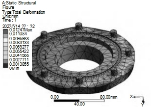 此外,通過仿真分析可以看出,應(yīng)力圖中大的應(yīng)力值范圍在71.637MPa~125.33MPa之間,小于不銹鋼的許用應(yīng)力值155MPa。所以,所設(shè)計旋轉(zhuǎn)接頭的外套結(jié)構(gòu)強度和剛度能夠滿足使用要求。