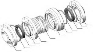 1.外套體2.次密封圈3.主密封圈4.止水環(huán)5.內(nèi)法蘭盤6.圓柱滾子7.塵封圈8.外法蘭盤9.防水墊片