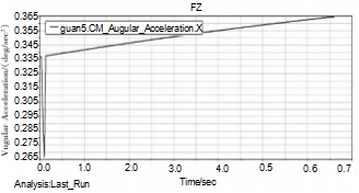 為了確保所設(shè)計自主補油裝卸鶴管的安全、有效,設(shè)計中基于adams軟件進行了運動仿真,并對裝卸鶴管末端關(guān)節(jié)的位移、速度和角加速度進行分析。圖9給出了相應(yīng)的位移、速度和角速度曲線。由位移圖可以看出,前2s之內(nèi)線性位移值為X軸從-2800~-2200,總位移量為600mm,呈對稱變化,后2s內(nèi)平穩(wěn)運動;由速度圖可以看出,末端關(guān)節(jié)大線性速度為每秒500mm,在經(jīng)過約2s后趨于穩(wěn)定,前2s內(nèi)速度在正負(fù)值每秒500mm區(qū)間波動,后2s停止運動,速度趨近于0;由角速度圖可以看出,角加速度一開始劇烈的下降到0.264°/(m2·s),0.1s之后緩速直線上升,趨于穩(wěn)定。
