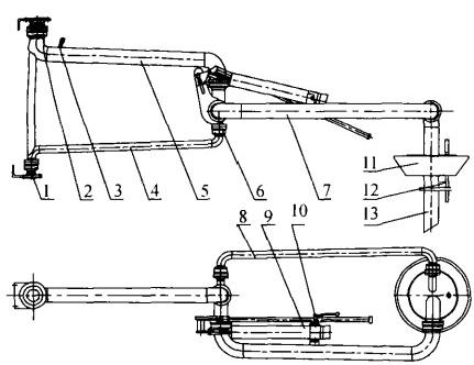 1一液相連接法蘭;2一氣相連接法蘭;3—排空閥;4一氣相內(nèi)臂;5—液相內(nèi)臂;6~旋轉(zhuǎn)接頭;7—氣相外臂;8—外臂平衡(彈簧缸);9—液相外臂;10—外臂鎖定裝置;11—集氣槽:12—垂管;13—液位探頭