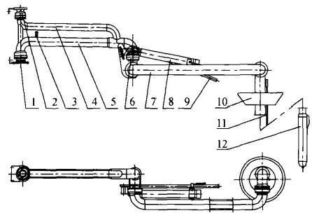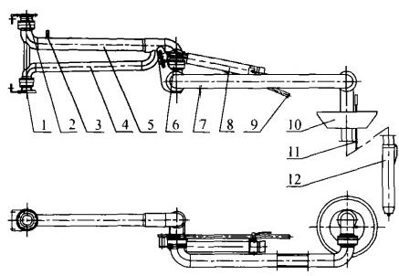 1一氣相連接法蘭;2—液相連接法蘭;3—排空閥;4—氣相內(nèi)臂;5—液相內(nèi)臂;6—旋轉(zhuǎn)接頭;7—液相外臂;8—氣相外臂;9—外臂平衡裝置(彈簧缸);10—外臂鎖定裝置;11—液位探頭;12—垂管