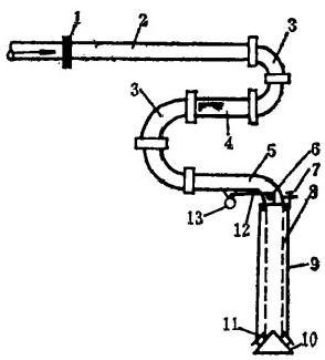 1—基礎(chǔ)法蘭;2—水平管;3—活絡(luò)彎頭;4—水平彎管;5一小臂管;6—滑輪;7—彈力掛鉤;8—垂直管;9一垂直套管;10—錐形浮子;11—下端口密封圈;12—鋼絲。